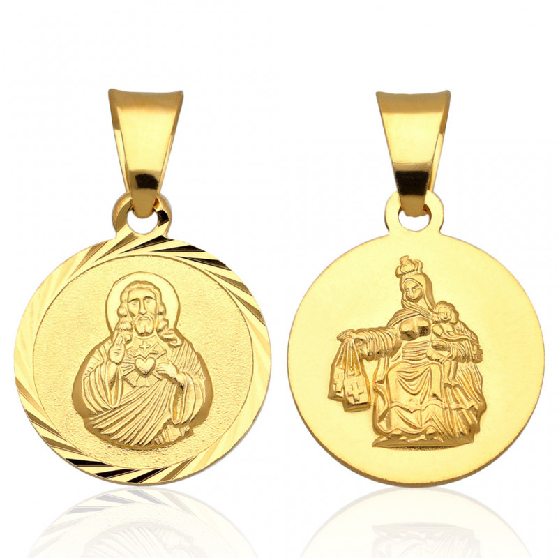 Jedna strona medalika przedstawia wizerunek Matki Bożej Szkaplerznej, a drugi Serca Pana Jezusa.