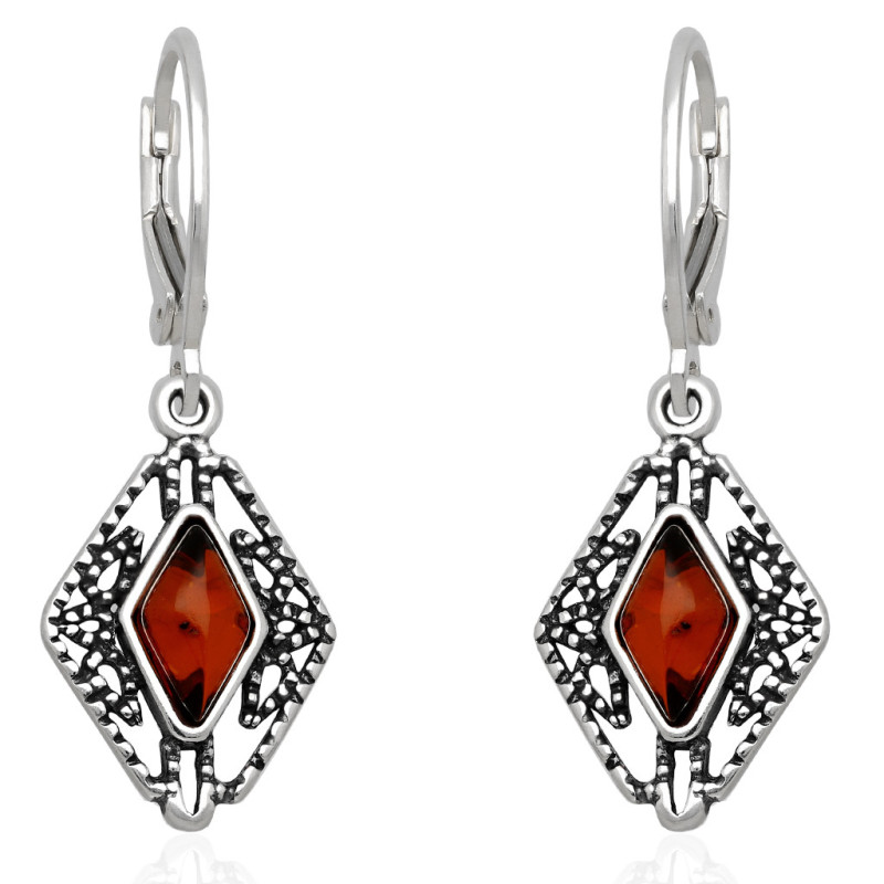 Przedmiotem sprzedaży są piękne oksydowane* kolczyki na angielskim zapięciu wykonane z najwyższej jakości srebra próby 925 ozdobione bursztynem w kolorze koniakowym.