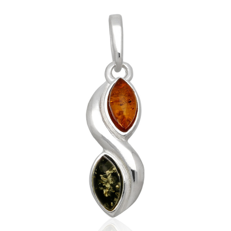 Przedmiotem sprzedaży jest piękny wisior wykonany z najwyższej jakości srebra próby 925 ozdobiony bursztynem w dwóch kolorach.