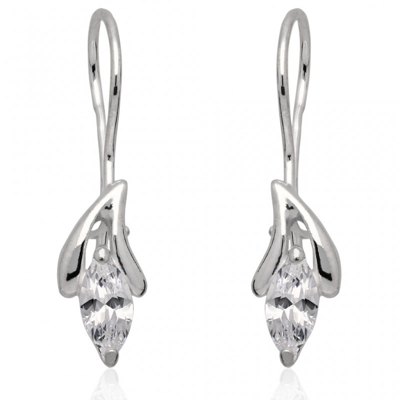 Piękne kolczyki na biglu wykonane ze srebra najwyższej próby 925 ozdobione cyrkoniami w kolorze kryształowym.