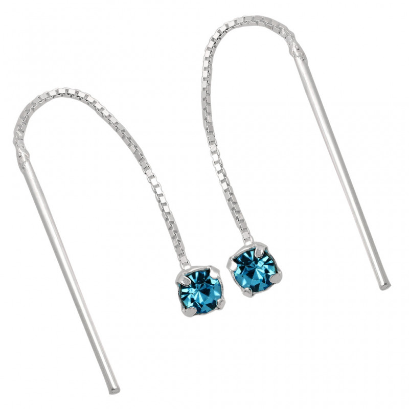 Piękne kolczyki przeciągane wykonane ze srebra najwyższej próby 925 ozdobione symilkami w kolorze niebieskim.