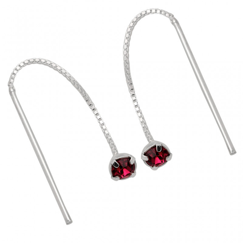 Piękne kolczyki przeciągane wykonane ze srebra najwyższej próby 925 ozdobione symilkami w kolorze fuksja.