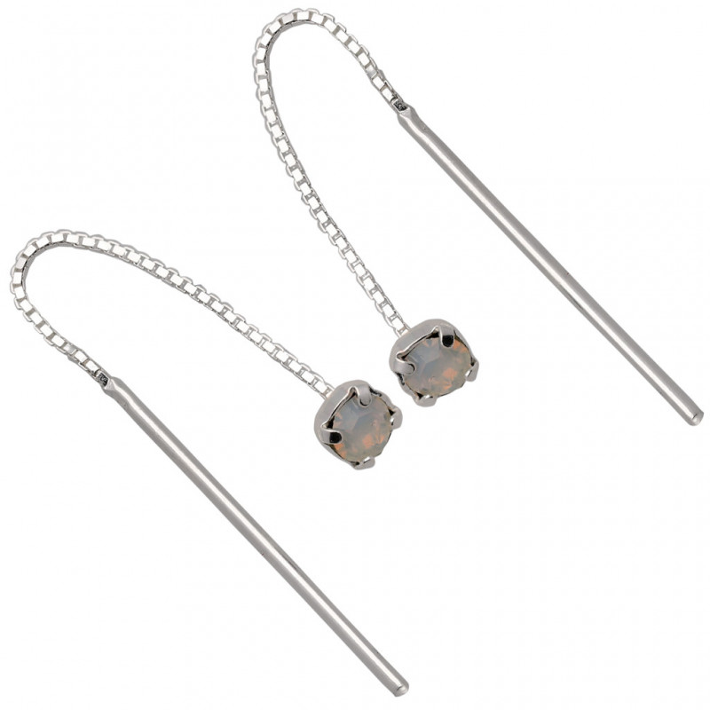 Piękne kolczyki przeciągane wykonane ze srebra najwyższej próby 925 ozdobione opalem w kolorze białym.