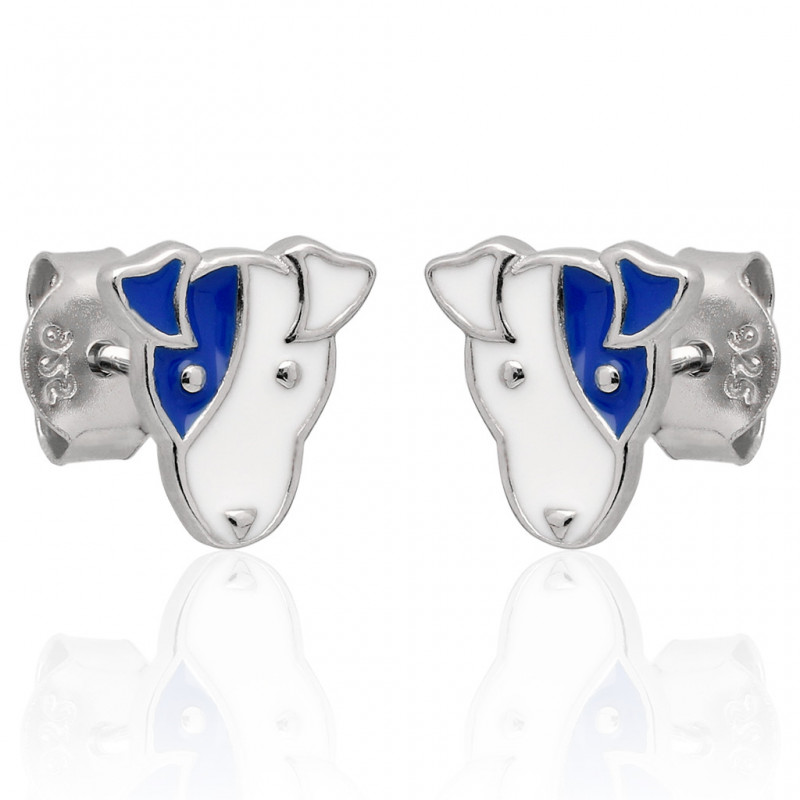 Przedmiotem sprzedaży są piękne rodowane* kolczyki na sztyfcie wykonane z najwyższej jakości srebra próby 925 ozdobione emalią w kolorze białym i niebieskim.