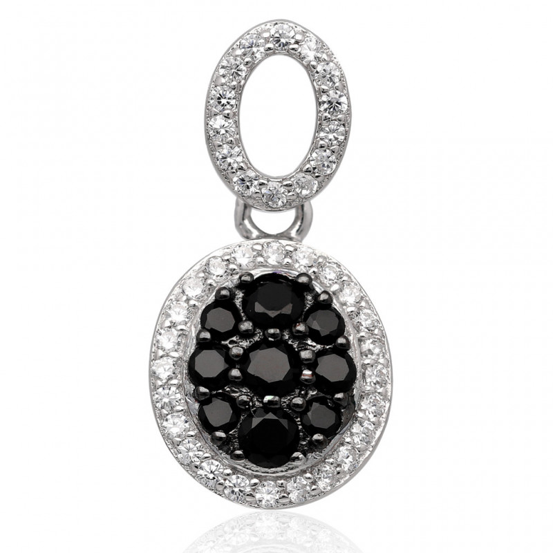 Przedmiotem sprzedaży jest piękny rodowany* wisior wykonany z najwyższej jakości srebra próby 925 ozdobiony cyrkoniami w kolorze kryształowym i czarnym.