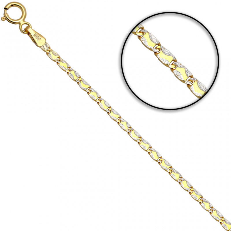 Przedmiotem sprzedaży jest łańcuszek złoty pełna blaszka z białym złotem.Produkt solidnie i precyzyjnie wykonany przez Włoskich producentów z najwyższej jakości 14 karatowego złota próby 585. Łańcuszek jest diamentowany dzięki czemu pięknie się błyszczy.