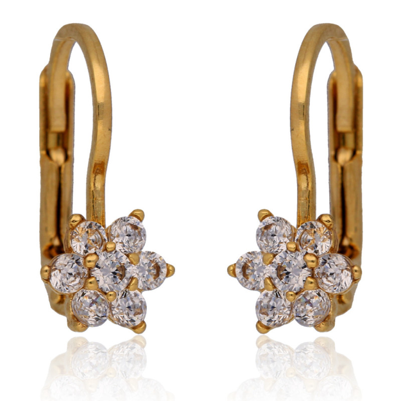 Piękne kolczyki kwiatki na angielskim zapięciu wykonane w całości z najwyższej jakości złota próby 585 ozdobione kryształowymi cyrkoniami.