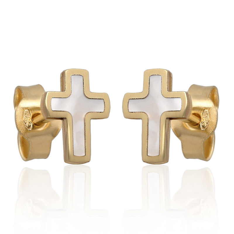 Piękne kolczyki krzyżyki na sztyfcie wykonane w całości z najwyższej jakości złota próby 585 ozdobione masą perłową w kolorze białym.