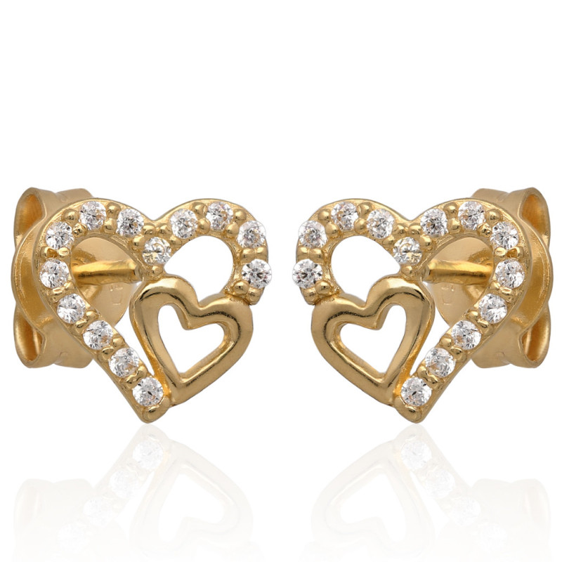 Piękne kolczyki podwójne serduszka na sztyfcie wykonane w całości z najwyższej jakości złota próby 585 ozdobione kryształowymi cyrkoniami.