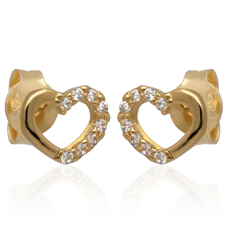 Piękne kolczyki serduszka na sztyfcie wykonane w całości z najwyższej jakości złota próby 585 ozdobione kryształowymi cyrkoniami.