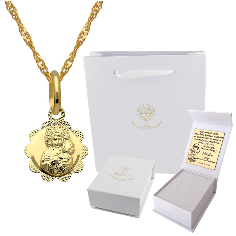 Przedmiotem sprzedaży jest złoty zestaw komunijny składający się z łańcuszka i medalika. Komplet wykonany z najwyższej jakości złota próby 585.