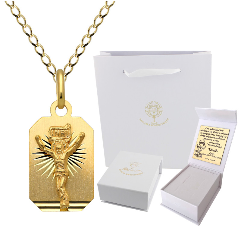 Przedmiotem sprzedaży jest złoty zestaw komunijny składający się z łańcuszka i medalika. Komplet wykonany z najwyższej jakości złota próby 585.