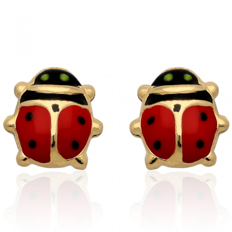 Piękne kolczyki biedronki na sztyfcie wykonane w całości z najwyższej jakości złota próby 585 ozdobione emalią w kolorze czerwonym i czarnym.