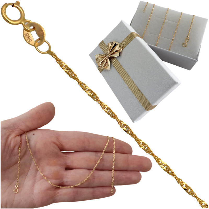 Przedmiotem sprzedaży jest łańcuszek złoty pełny singapur.Produkt solidnie i precyzyjnie wykonany przez Włoskich producentów z najwyższej jakości 14 karatowego złota próby 585. Łańcuszek jest diamentowany dzięki czemu pięknie się błyszczy.