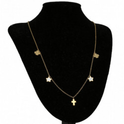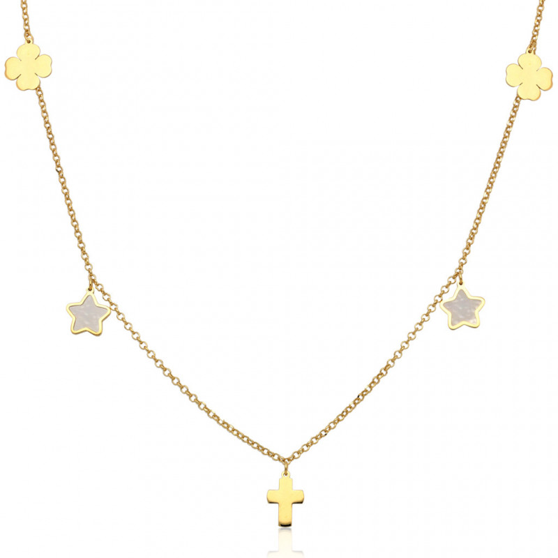 Naszyjnik złoty koniczynka,krzyżyk i gwiazdki ozdobione masą perłową. Naszyjnik wykonany z najwyższej jakości 14 karatowego złota próby 585.