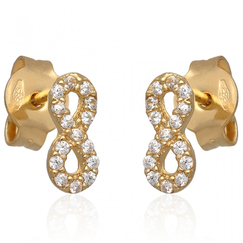 Piękne kolczyki nieskończoność na sztyfcie wykonane w całości z najwyższej jakości złota próby 585 wysadzane kryształowymi cyrkoniami.