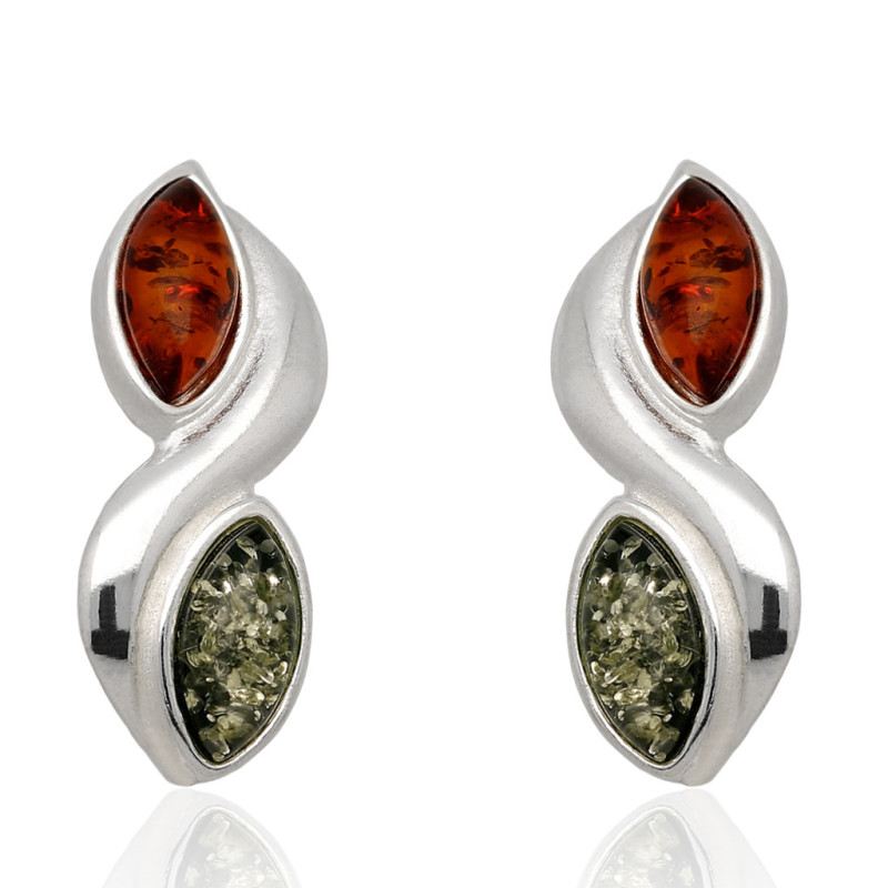 Przedmiotem sprzedaży są piękne kolczyki na sztyfcie wykonane z najwyższej jakości srebra próby 925 ozdobione bursztynem w kolorze koniakowym i zielonym.
