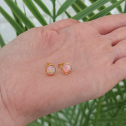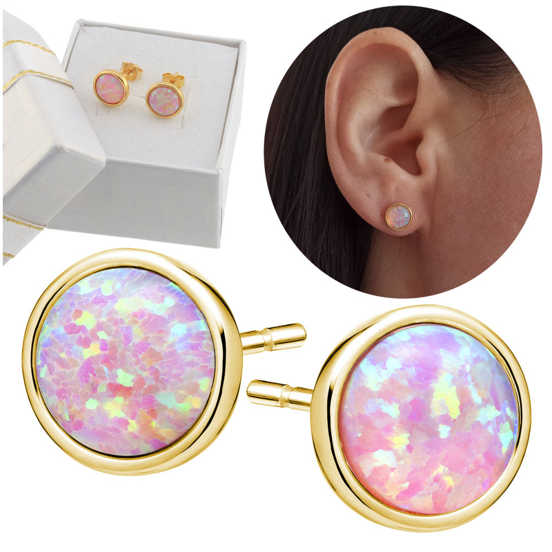 Przedmiotem sprzedaży są piękne pozłacane* okrągłe kolczyki z różowym opalem na sztyfcie wykonane z najwyższej jakości srebra próby 925.