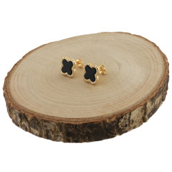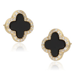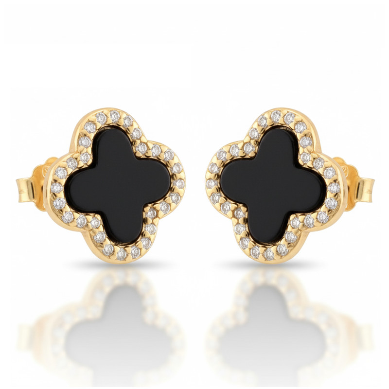 Przedmiotem sprzedaży są piękne pozłacane* kolczyki koniczynki na sztyfcie z onyksem, ozdobione diamentowymi cyrkoniami, wykonane z najwyższej jakości srebra próby 925.