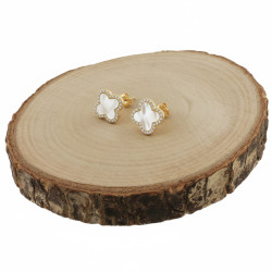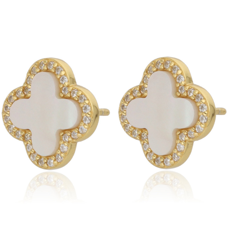 Przedmiotem sprzedaży są piękne pozłacane* kolczyki koniczynki na sztyfcie z masą perłową i cyrkoniami, wykonane z najwyższej jakości srebra próby 925.
