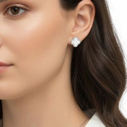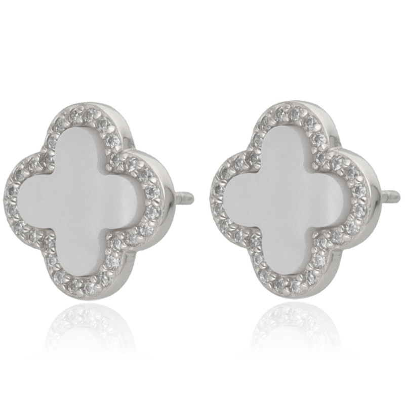 Przedmiotem sprzedaży są piękne rodowane* kolczyki koniczynki na sztyfcie z masą perłową, dodatkowo ozdobione diamentowymi cyrkoniami wykonane z najwyższej jakości srebra próby 925.