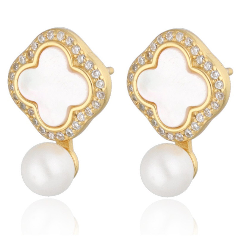 Przedmiotem sprzedaży są piękne pozłacane* kolczyki koniczynki na sztyfcie z masą perłową, cyrkoniami i perełkami, wykonane z najwyższej jakości srebra próby 925.