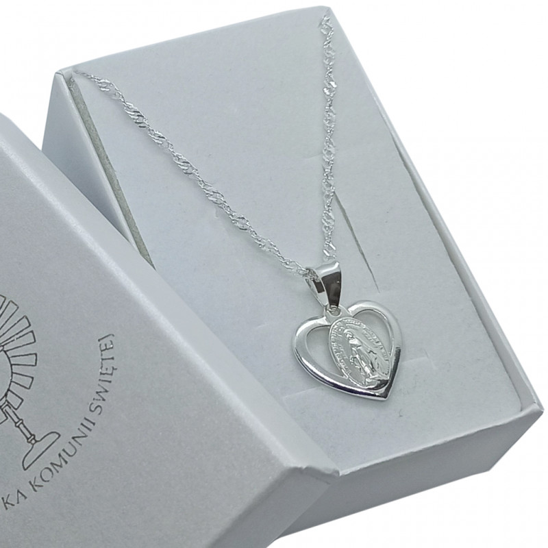 Przedmiotem sprzedaży jest srebrny zestaw komunijny składający się z łańcuszka i cudownego medalika. Komplet wykonany z najwyższej jakości srebra próby 925.