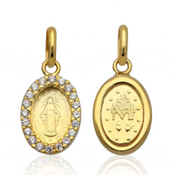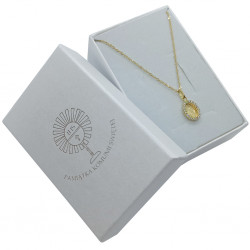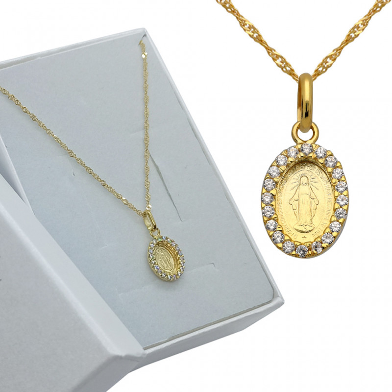 Przedmiotem sprzedaży jest złoty zestaw komunijny składający się z łańcuszka i cudownego medalika z cyrkoniami. Komplet wykonany z najwyższej jakości złota próby 585.