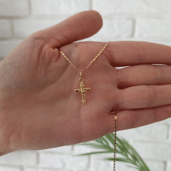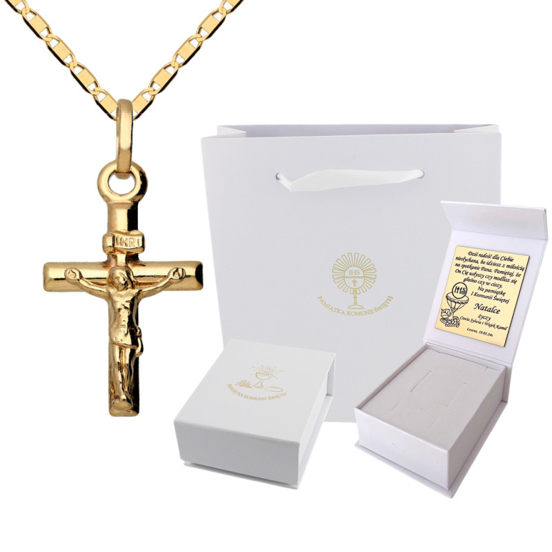 Przedmiotem sprzedaży jest złoty zestaw komunijny składający się z łańcuszka i krzyżyka z pasyjką.