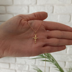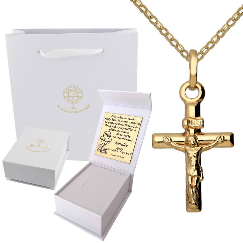 Przedmiotem sprzedaży jest złoty zestaw komunijny składający się z łańcuszka i krzyżyka z pasyjką.