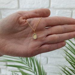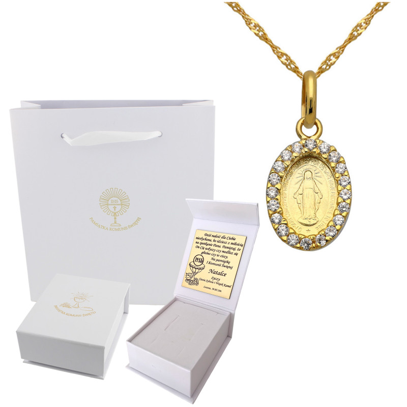 Przedmiotem sprzedaży jest złoty zestaw komunijny składający się z łańcuszka i cudownego medalika z cyrkoniami. Komplet wykonany z najwyższej jakości złota próby 585.
