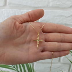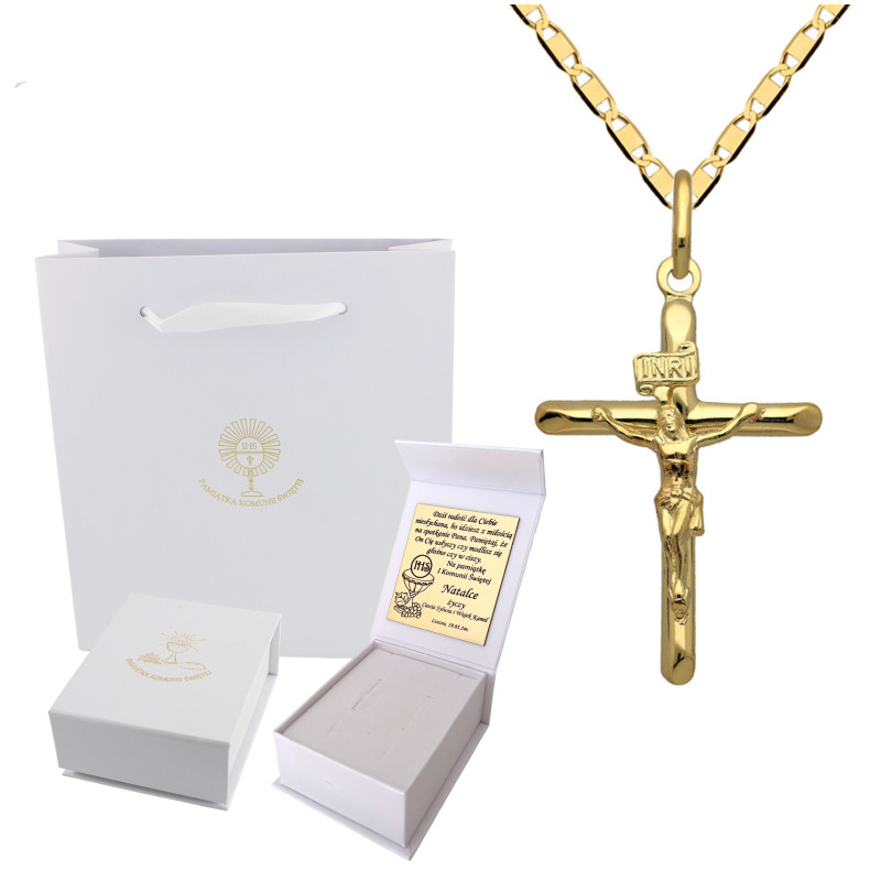 Przedmiotem sprzedaży jest złoty zestaw komunijny składający się z łańcuszka i krzyżyka z pasyjką.