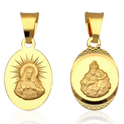 Jedna strona medalika przedstawia wizerunek Matki Bożej Szkaplerznej, a drugi Serca Pana Jezusa.