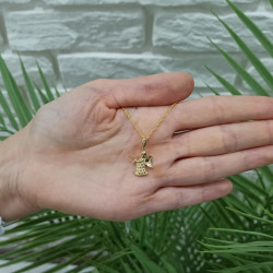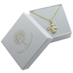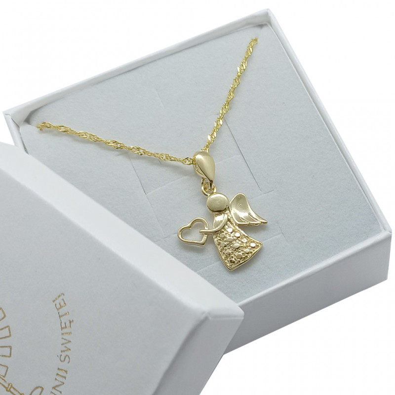 Przedmiotem sprzedaży jest srebrny zestaw komunijny składający się z pozłacanego łańcuszka i wisiorka w kształcie aniołka. Komplet wykonany z najwyższej jakości srebra próby 925.