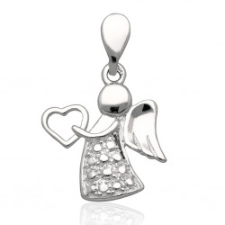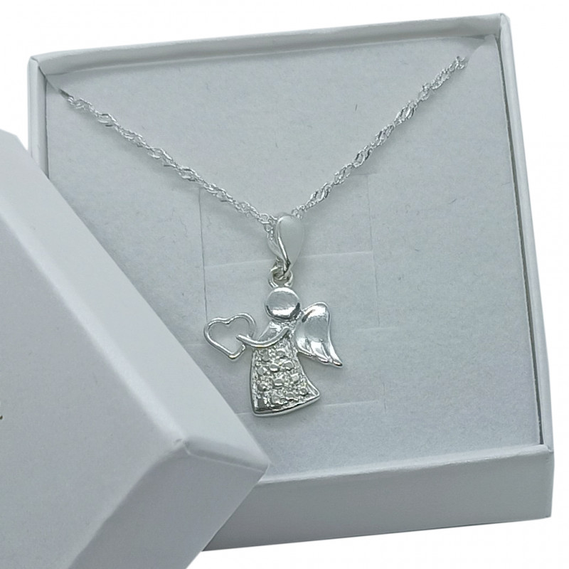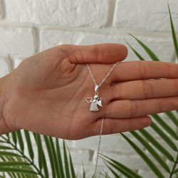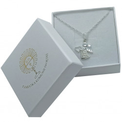 Przedmiotem sprzedaży jest srebrny zestaw komunijny składający się z łańcuszka i wisiorka w kształcie aniołka. Komplet wykonany z najwyższej jakości srebra próby 925.