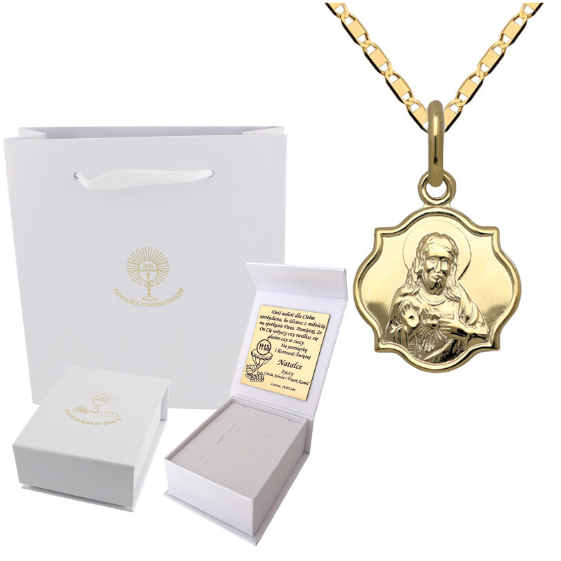 Przedmiotem sprzedaży jest złoty zestaw komunijny składający się z łańcuszka i medalika z wizerunkiem M.B.Szkaplerznej.