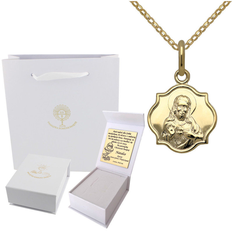 Przedmiotem sprzedaży jest złoty zestaw komunijny składający się z łańcuszka i medalika z wizerunkiem M.B.Szkaplerznej.
