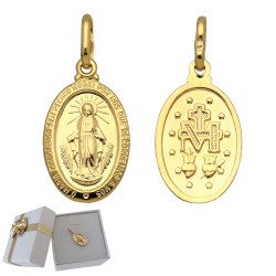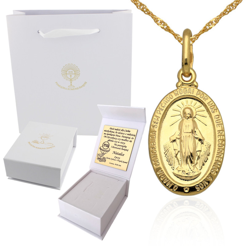 Przedmiotem sprzedaży jest złoty zestaw komunijny składający się z łańcuszka i cudownego medalika. Komplet wykonany z najwyższej jakości złota próby 585.