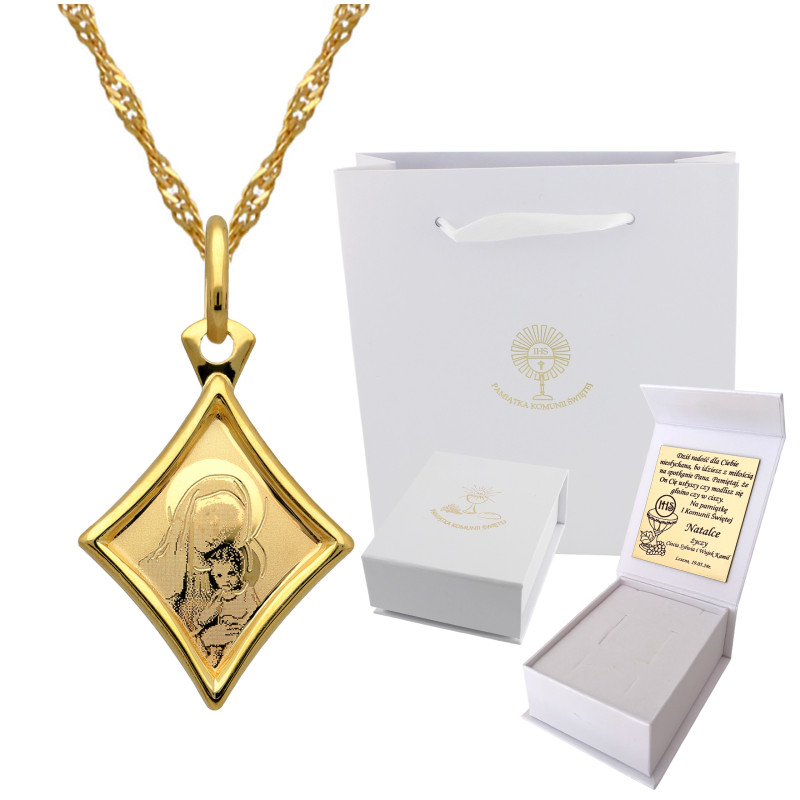 Przedmiotem sprzedaży jest złoty zestaw komunijny składający się z łańcuszka i medalika.
