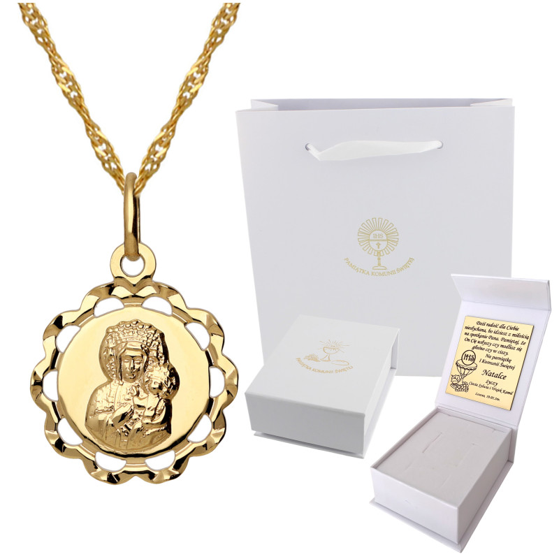 Przedmiotem sprzedaży jest złoty zestaw komunijny składający się z łańcuszka i medalika.