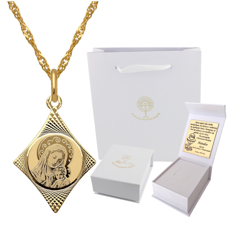 Przedmiotem sprzedaży jest złoty zestaw komunijny składający się z łańcuszka i medalika.