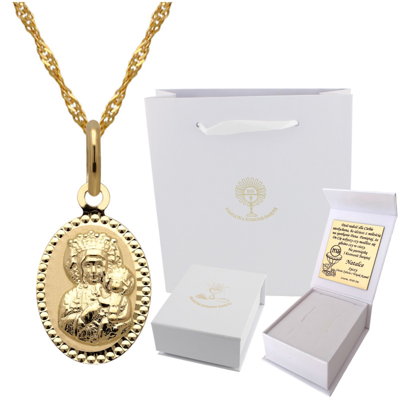 Przedmiotem sprzedaży jest złoty zestaw komunijny składający się z łańcuszka i medalika.