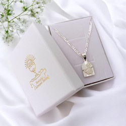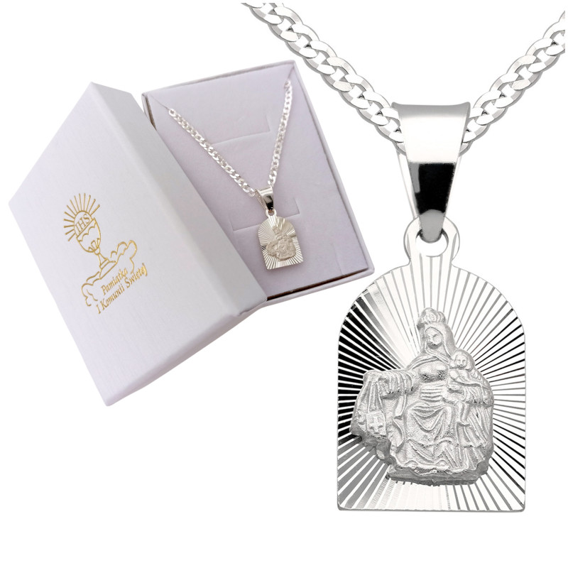 Przedmiotem sprzedaży jest srebrny zestaw komunijny składający się z medalika i łańcuszka. Komplet wykonany z najwyższej jakości srebra próby 925.