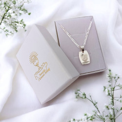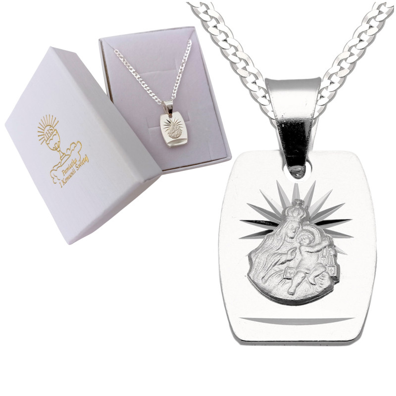 Przedmiotem sprzedaży jest srebrny zestaw komunijny składający się z medalika i łańcuszka. Komplet wykonany z najwyższej jakości srebra próby 925.
