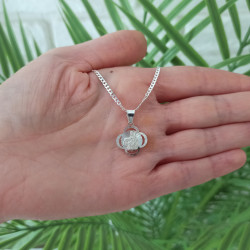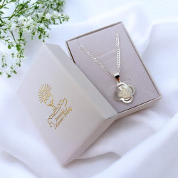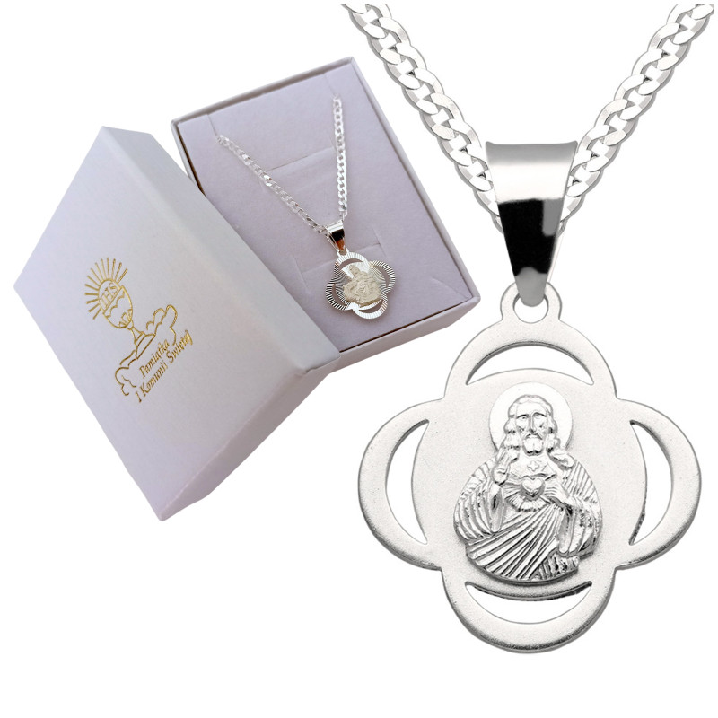 Przedmiotem sprzedaży jest srebrny zestaw komunijny składający się z medalika i łańcuszka. Komplet wykonany z najwyższej jakości srebra próby 925.