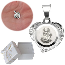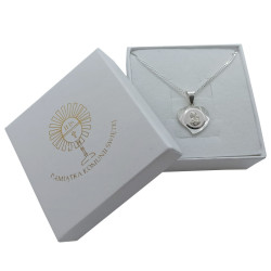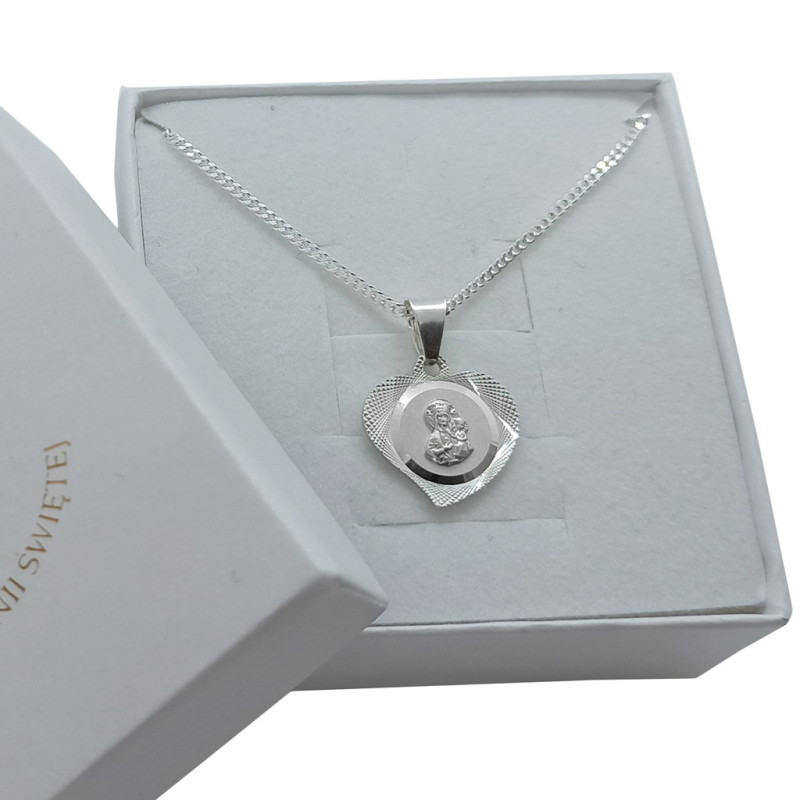 Przedmiotem sprzedaży jest srebrny zestaw komunijny składający się z łańcuszka i medalika z pozłacanym wizerunkiem. Komplet wykonany z najwyższej jakości srebra próby 925.