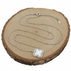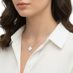 Przedmiotem sprzedaży jest piękny rodowany* naszyjnik koniczynka z masą perłową i cyrkoniami wykonany z najwyższej jakości srebra próby 925.